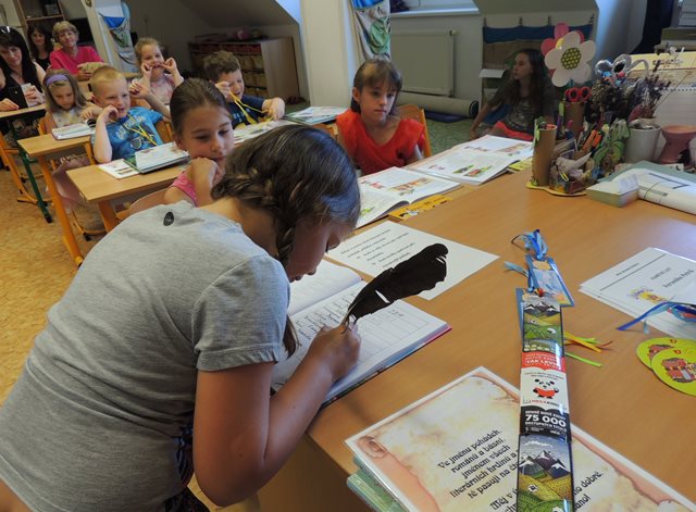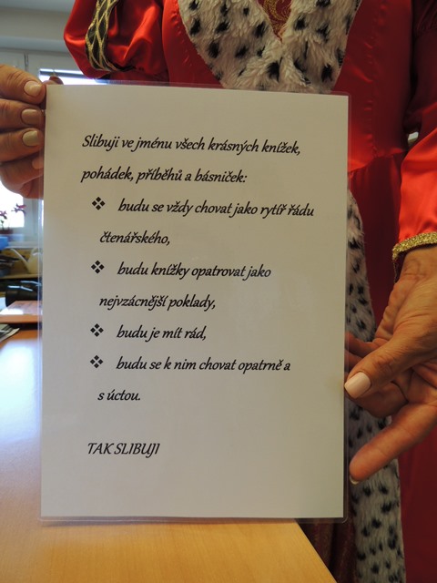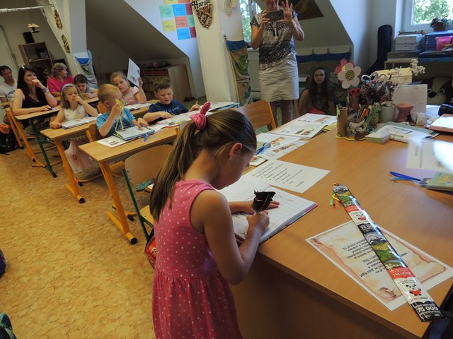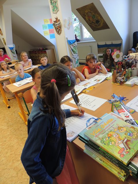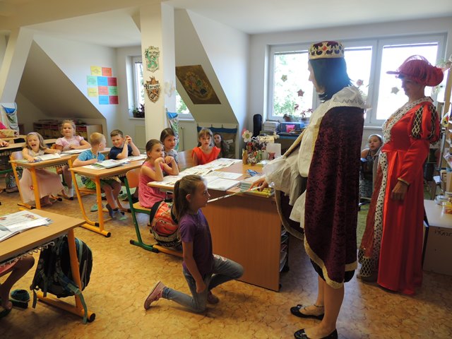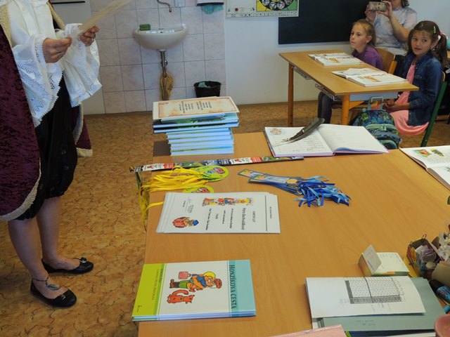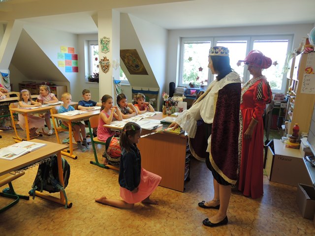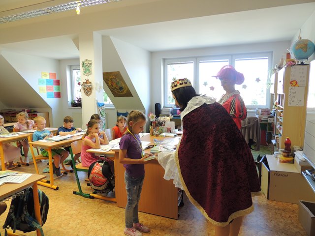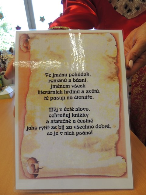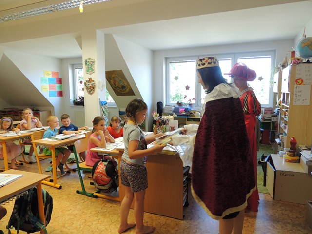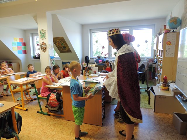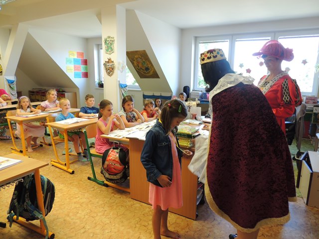 V úterý 18. 6. proběhlo ve škole slavnostní pasování prvňáčků na čtenáře. Pasovat je nepřišel jen tak někdo, jak je vidět z fotografií. Jakmile si vyslechly krátkou pohádku, musely děti samy ukázat, že jsou dobrými čtenáři. Poté, co složili slavnostní slib, byl každý slavnostně pasován na čtenáře. Děti si odnesly i krásnou knihu, záložku, pamětní list a medaili. Děkujeme paní M. Kopáčkové a J. Bažatové z OÚ za tento krásný a nezapomenutelný okamžik, který dětem a jejich blízkým připravily.