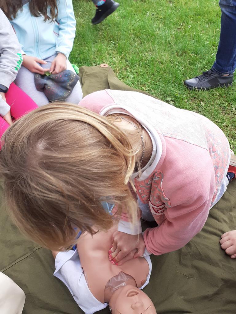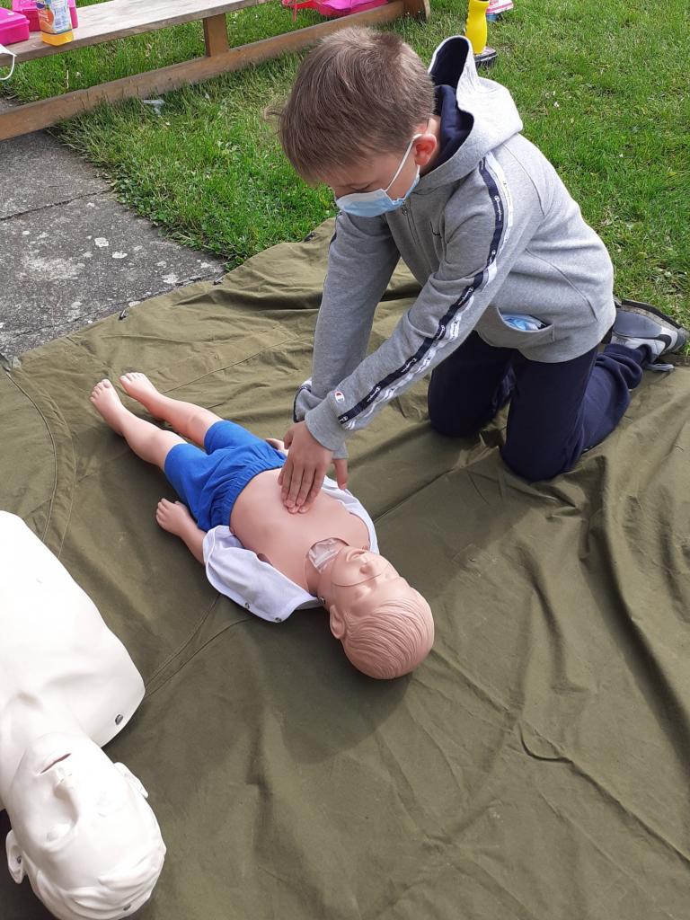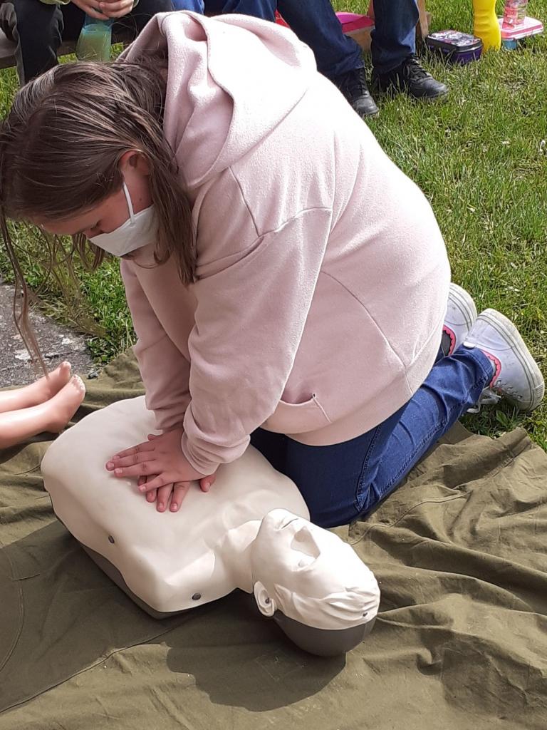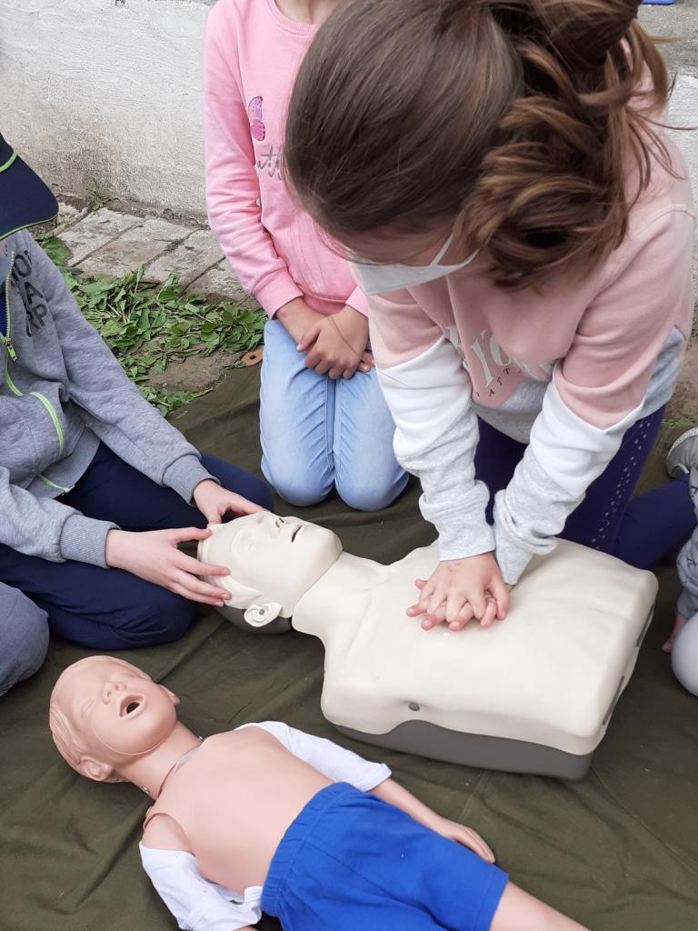 Žáci provádějí masáž srdce dítěte a dospělého člověka.
