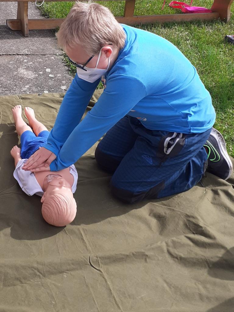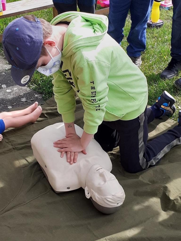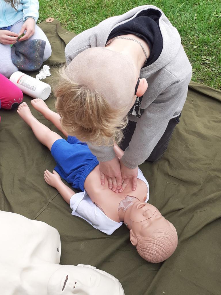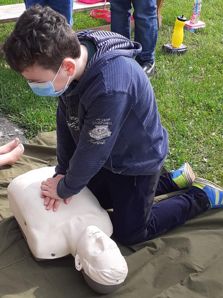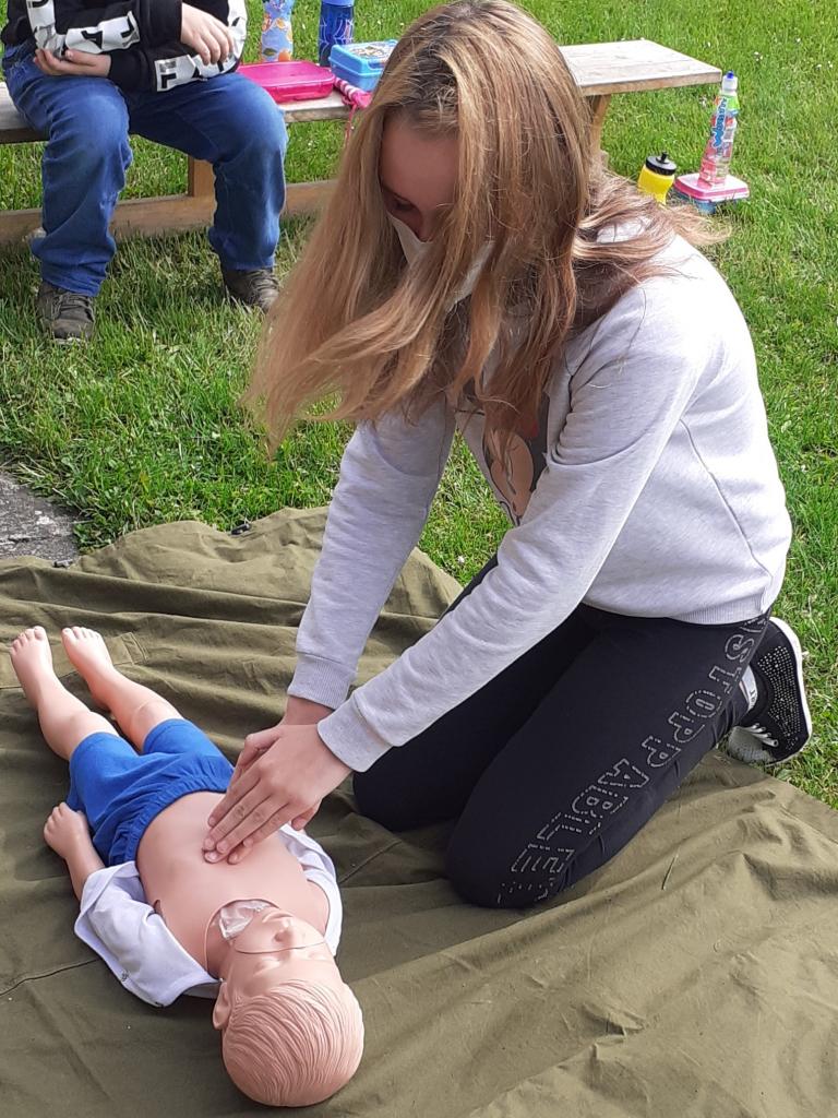 Žáci provádějí masáž srdce dítěte a dospělého člověka.