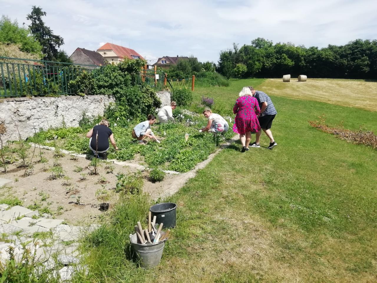 Před Zahradní slavností jsme využili čas a ještě jsme zapojili zúčastněné rodinné příslušníky - maminky, tatínky i babičky do projektu Skutečně zdravá škola společnou prací na školním pozemku.
