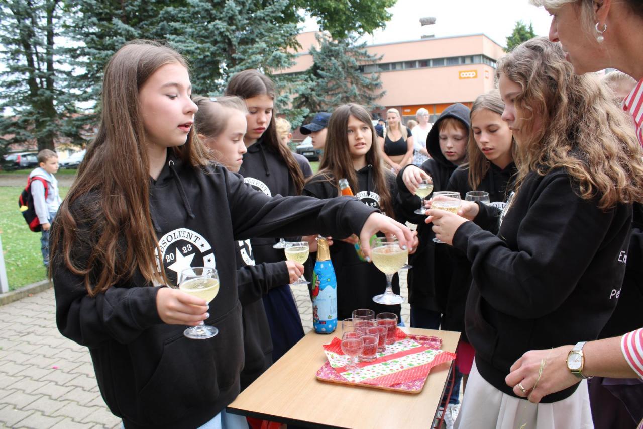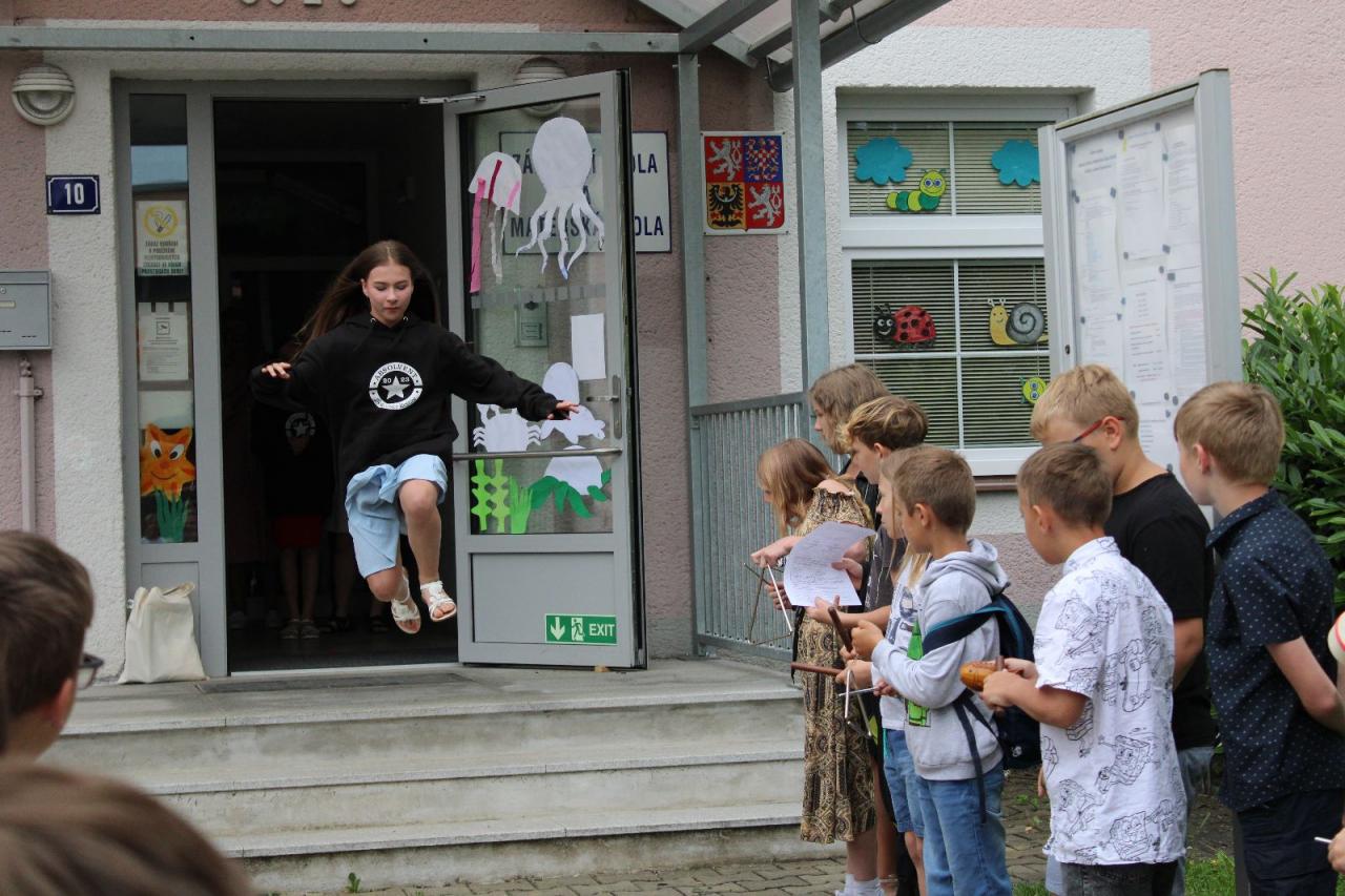 Vysvědčení a dárky jsme dětem z 5. r. předali za přítomnosti hostů z místního obecního úřadu v obřadní síni a ve škole se s nimi rozloučili mladší děti posledním zvoněním. Každý si užil svou chvilku slávy, když procházel špalírem dětí a nakonec jsme si všichni připili na krásné léto.