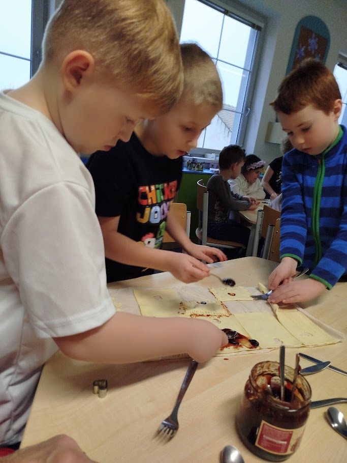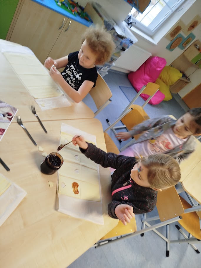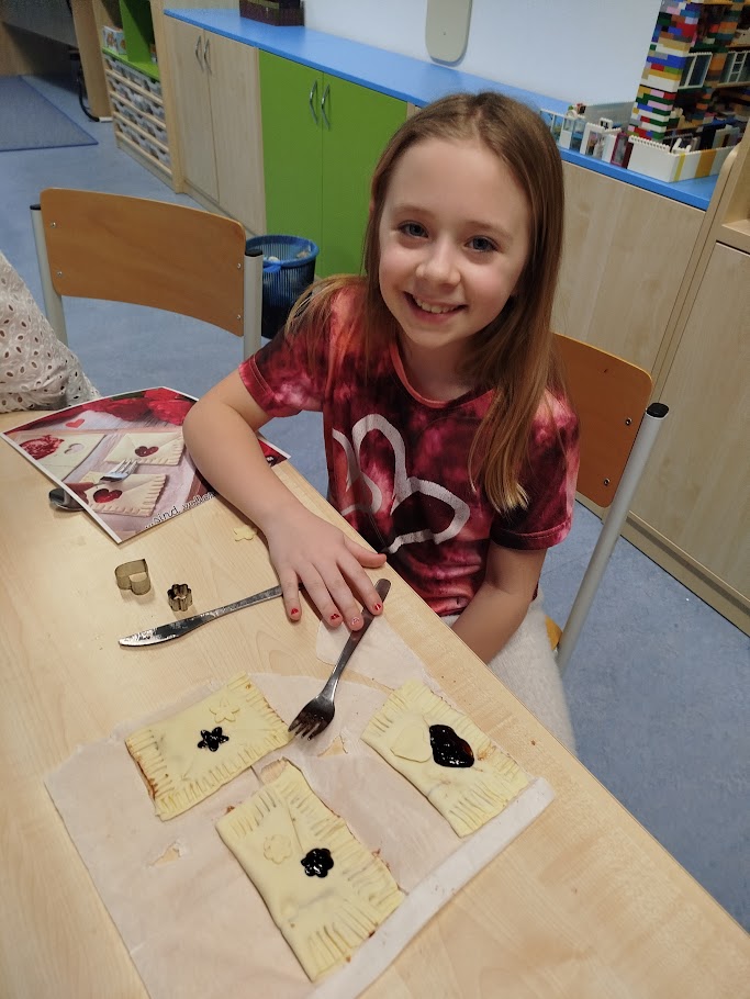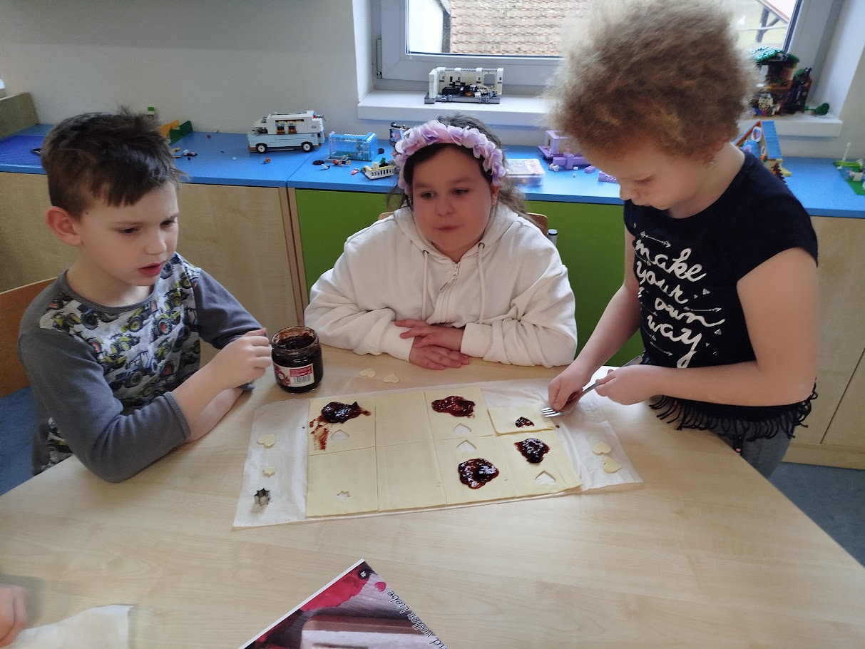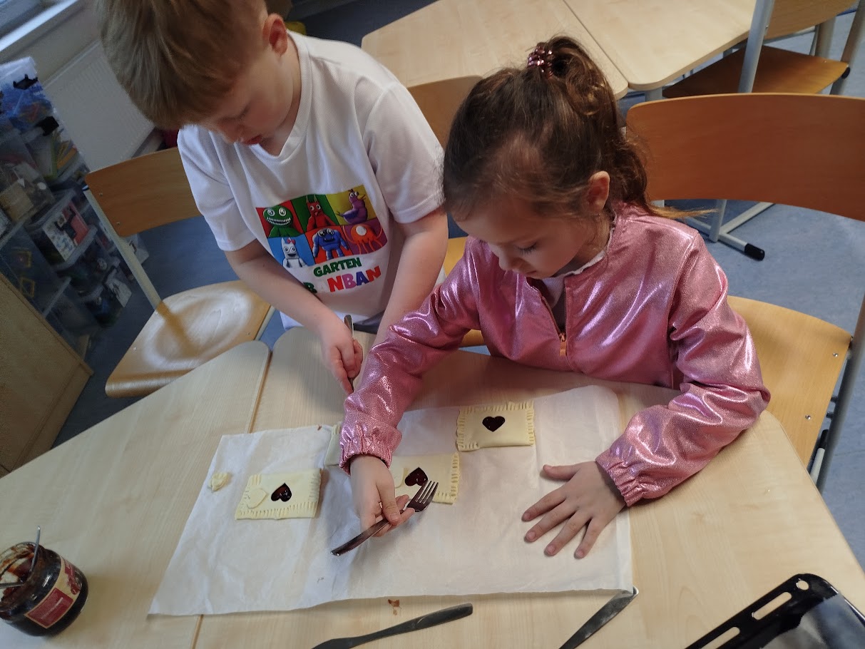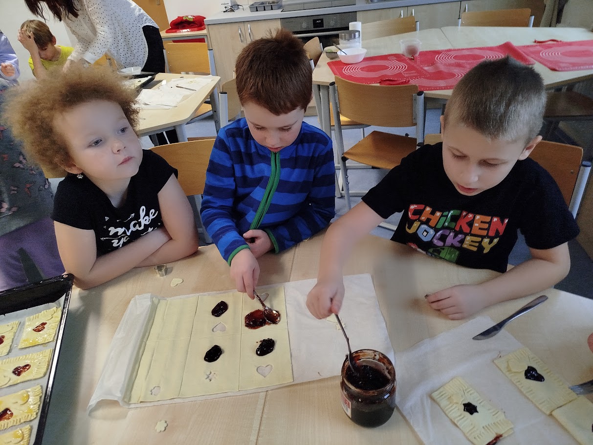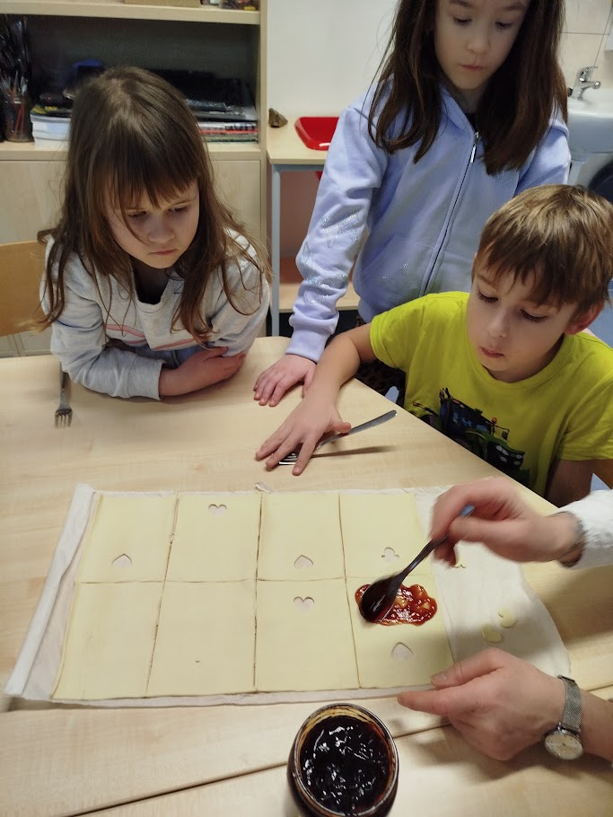 Při Valentýnském pečení si děti s chutí připravovaly listové obálky plněné marmeládou. Práce jim šla pěkně od ruky. Nechyběl smích, spolupráce ani malé ochutnávací „kontroly kvality“. Hotové valentýnské obálky byly sladkým důkazem, že když se peče s láskou, radost je dvojnásobná.