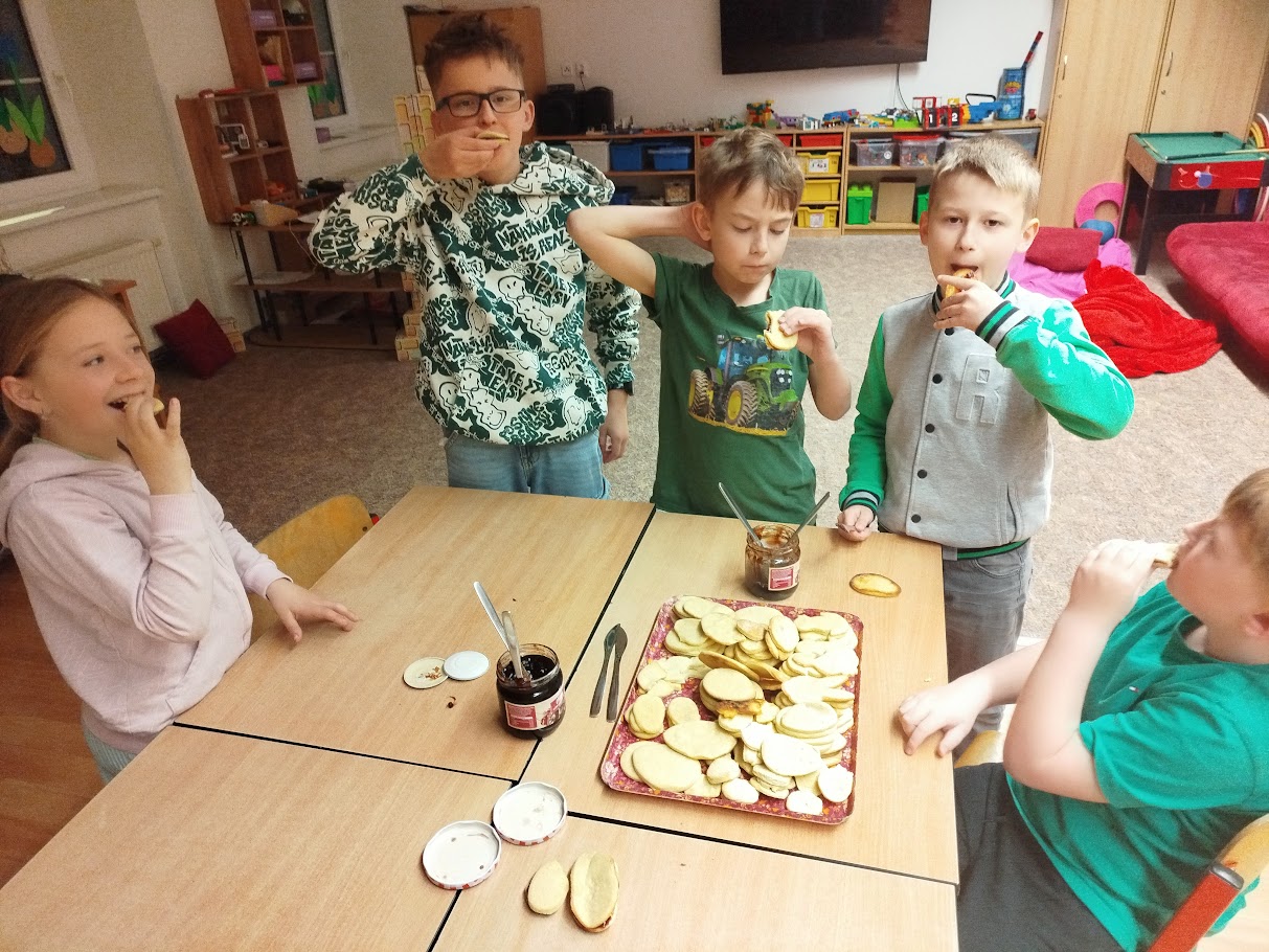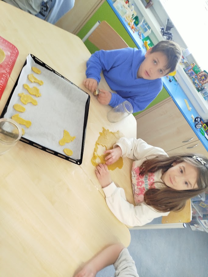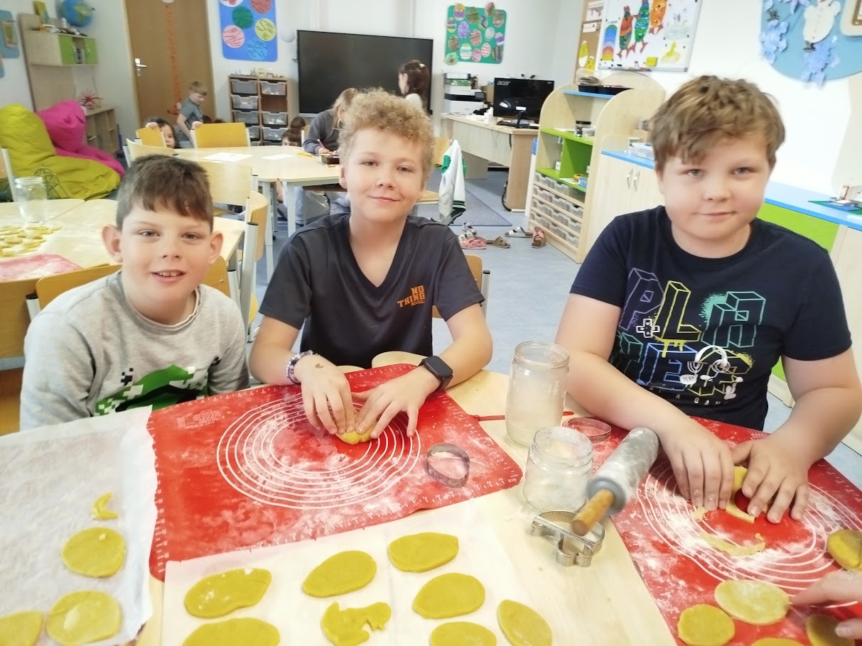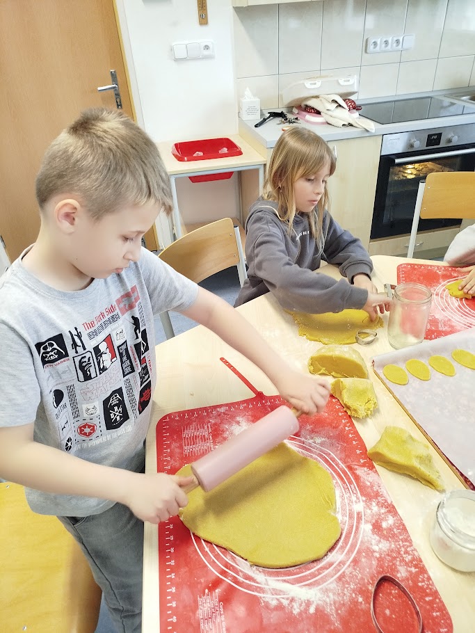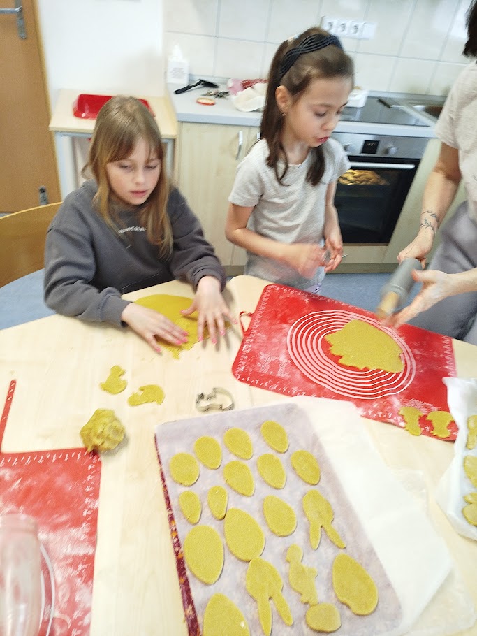 Při velikonočním pečení z lineckého těsta jsme si připomněli tradice Velikonoc. Vykrajovali jsme tvary vajíček, slepiček a zajíčků a po upečení je slepovaly marmeládou. Práce nás velmi bavila a procvičili jsme si zručnost i trpělivost. Provázela nás příjemná atmosféra a vůně čerstvého cukroví.